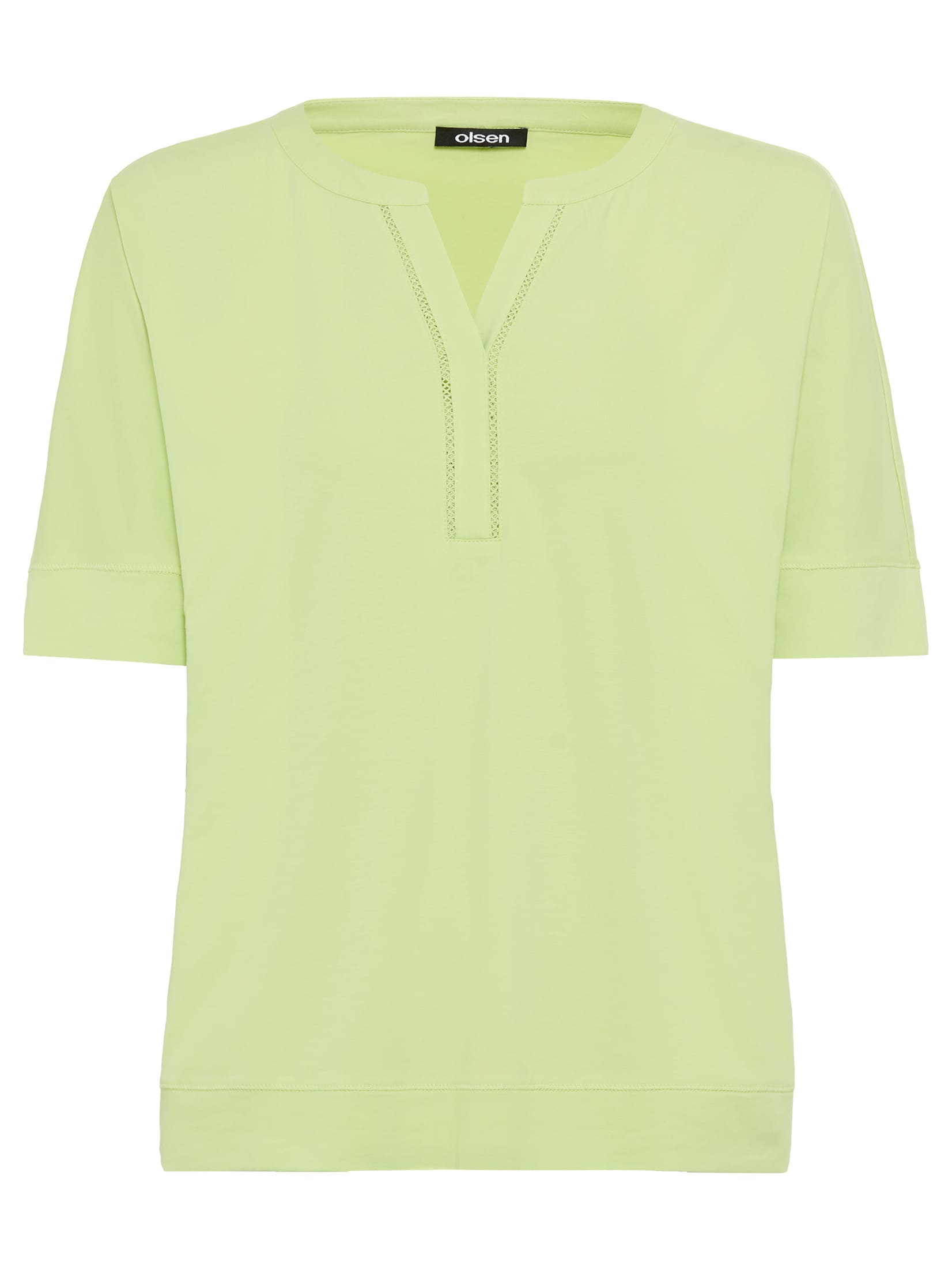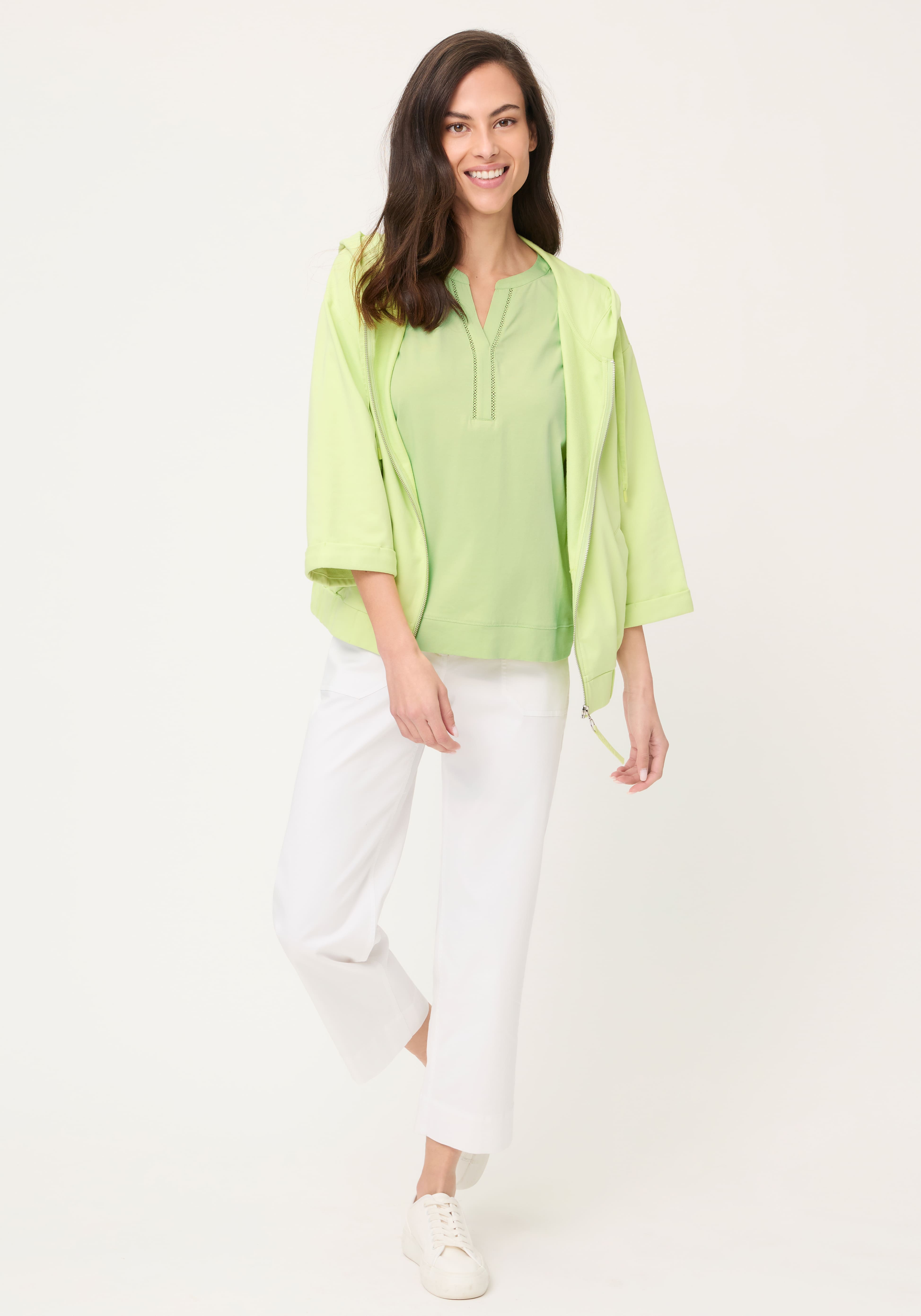Bluzka z elastycznej bawełny w świeżym, limonkowym odcieniu. Model o prostym kroju z tunikowym dekoltem - okrągłym z delikatnym rozcięciem w kształcie litery V, wykończonym ażurową listwą. Opadające krótkie rękawy oraz dół bluzki zakończono delikatnymi ściągaczami. Gładka forma i jasny kolor sprawiają, że bluzka świetnie komponuje się zarówno z jasnymi spodniami, jak i z modelami w odcieniach khaki czy beżu, tworząc spójne stylizacje w stylu casual i smart casual.